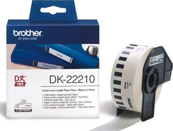 Genuine Brother DK22210 durable white paper tape uses direct thermal printing technology to create labels for parcels, envelopes and a large number of other things. The Brother DK-22205 continuous black on white tape has a manufacturer part number that is typically shown as DK-22210 or DK22210, while the Brother DK22210 label tape size is 29mm x 30.48m. Original Brother DK-22210 continuous length tape is coloured white and intended for printing black text.